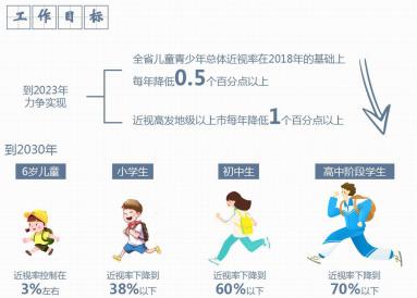2018年8月經(jīng)國務(wù)院同意,教育部、國家衛(wèi)生健康委員會等相關(guān)政府部門聯(lián)合印發(fā)《綜合防控兒童青少年近視實施方案》,要求到2023年力爭實現(xiàn)全省兒童青少年總體近視率在2018年的基礎(chǔ)上每年降低0.5個百分點以上,視力健康整體水平顯著提升。