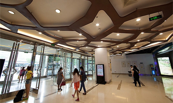 商場的入口是第一印象空間,吸引顧客進入商場的點睛之地,設計師和經營商為了滿足顧客的需求都會將其作為商場的重點空間。一般商場的天花都在3米左右,多采用led筒燈及led格柵燈盤搭配進行整體照明,同時還采用天花的造型來突出商場不同區域的氛圍。