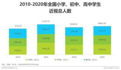 據《2022年中國兒童青少年視覺健康白皮書》顯示:全國兒童青少年近視防控形勢嚴峻,尤其是在2014年,全國小學、初中、高中學生近視人數突破一億人,其中小學生近視率為46%,中學生近視率為74%,而高中生近視率已達到83%。在嚴峻的形勢下,近年來政府高度關注兒童青少年的近視情況,進一步強化了兒童青少年近視防控的政策,并要求各地政府切實落實相關措施。
