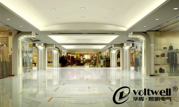 百貨商場屬于室內公共活動空間,人流量大,良好的通道照明能給顧客提供正確的流動指引,保證顧客和商場的財務安全,可采用高效率節能筒燈排列安裝于天花板,達到充足均勻的光線。