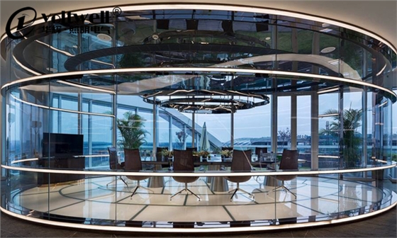 會議室內的橢圓金屬亮面現代造型吊燈,三層同心橢圓向上出光,打到棚上玻璃鏡后全屋將光線漫反射至全空間。這樣的布燈方式,再配合寬大的落地玻璃,通透、自然,能夠完美的形成一種“天為上”的空間感覺。