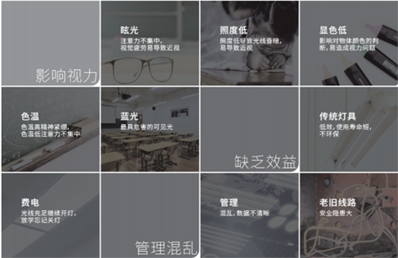 目前教室燈光存在問題包括中小學教室整體照明水平不高,照度均勻度較差,黑板照度及均勻度普遍較低,普遍存在忽視色溫及顯色指數的情況;照明設備老化、照明標準不完善、安裝技術規范更新不及時、照明方案設計不合理等。呵護學生的視力健康應從為學生提供符合國家標準的教室照明開始。