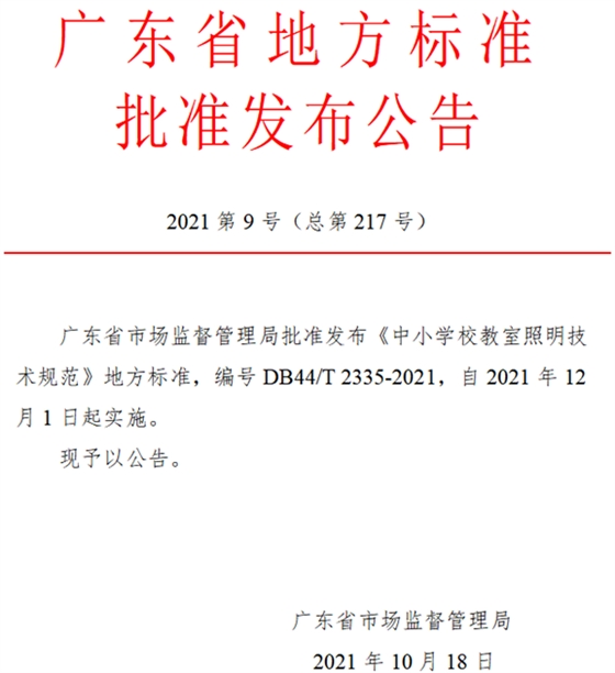 《廣東省地方標準<中小學校教室照明技術規范>》于2021年12月1日起正式實施。該標準適用于新建、擴建、改建和實施照明改造的中小學校教室,包括普通教室、實驗室、閱覽室、舞蹈教室、美術教室、書法教室、計算機教室、記憶電子閱覽室等教室場所。2023年底,確保完成學校教室照明100%符合國家標準要求,廣東省將全面完成中小學校教室照明達標任務。
