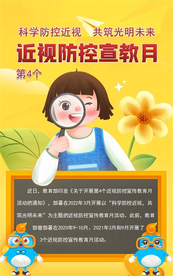 為深入貫徹習近平總書記關于兒童青少年近視防控的重要指示精神,推動各地和學校全面落實《綜合防控兒童青少年近視實施方案》、《兒童青少年近視防控光明行動工作方案(2021—2025年)》、《教育部等五部門關于全面加強和改進新時代學校衛生與健康教育工作的意見》,進一步營造近視防控宣傳教育氛圍,推動全社會行動起來,共同呵護好孩子的眼睛,讓他們擁有一個光明的未來,教育部以“科學防控近視,共筑光明未來”為主題開展第4個近視防控宣傳教育月活動。