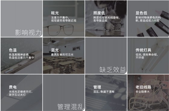從華輝教育照明歷年來對中小學校照明改造經驗來看,大部分教室照明存在以下問題:教室內課桌和黑板的平均照度低、照度不達標、眩光值偏高、燈具位置過高、光衰嚴重……