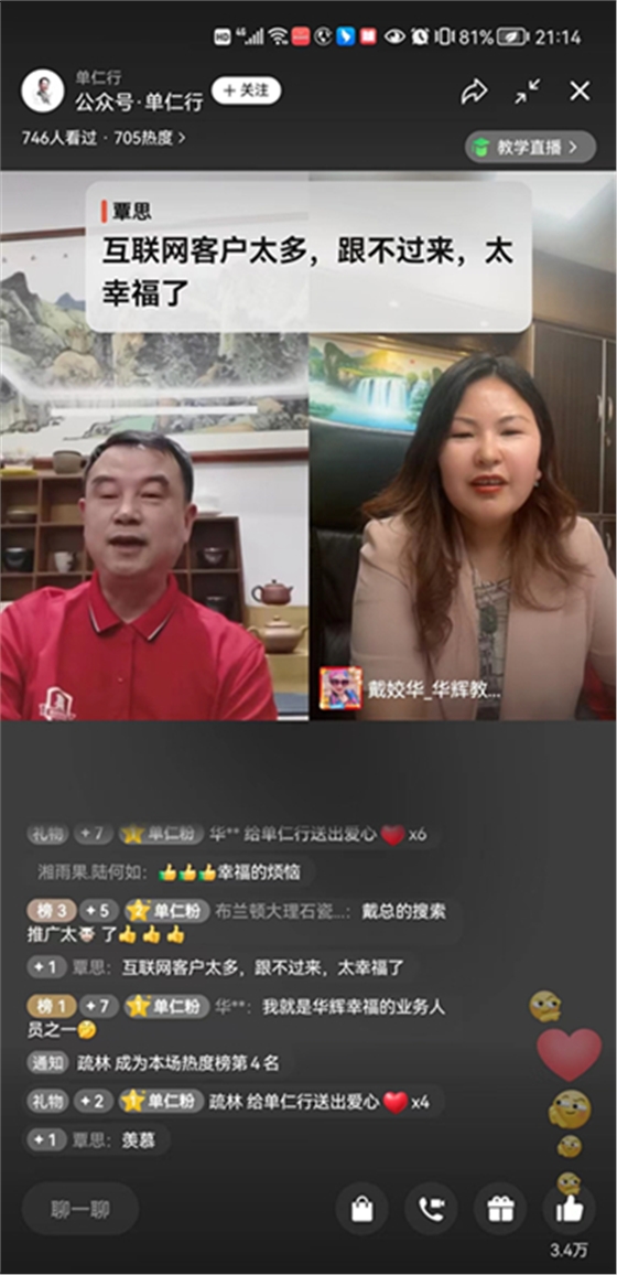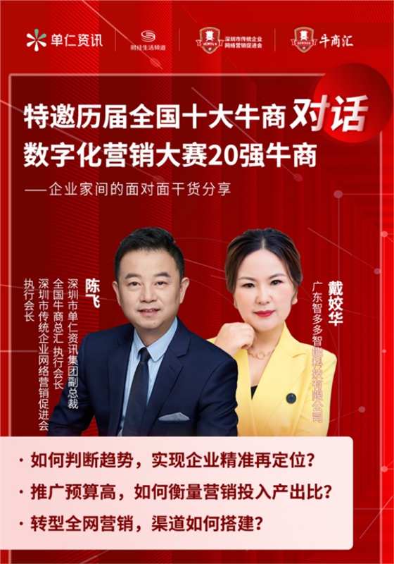 2022年4月16日20:00到22:00,單仁資訊特邀歷屆全國十大牛商對話數字話營銷大賽20強牛商,實現企業家間的面對面干貨分享。此次對話的是全國牛商總匯執行會長陳飛會長與華輝教育照明總經理戴姣華女士,兩位湖南湘潭人在直播間探討全網營銷。